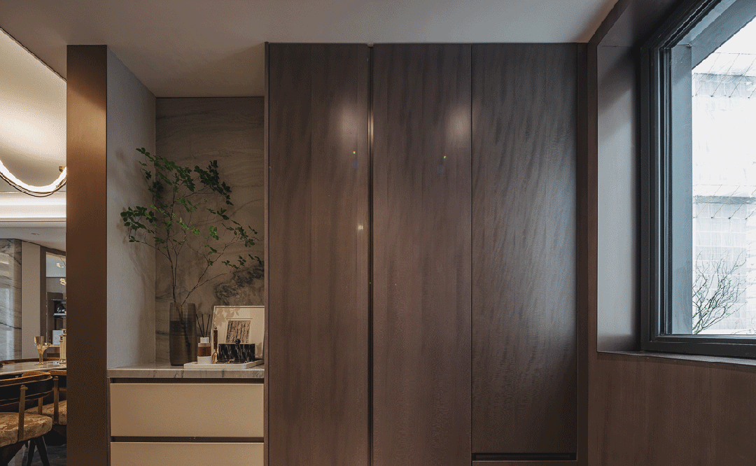 在交付配套之中高阶定制餐柜空间,提供更多收纳空间之外,也增加空间视觉层次。