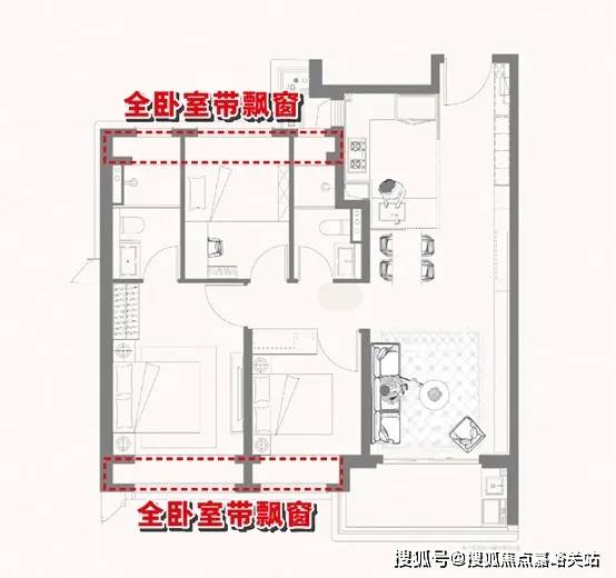 户型结构:主力户型(面积、居室数量)、布局设计(南北通透 / 动静分区)、得房率、赠送面积、飘窗 / 阳台配置