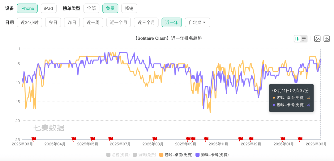 《Solitaire Clash》是目前北美地区运营最为成功的纸牌游戏APP之一,基本常年位居卡牌品类免费下载榜第一位。